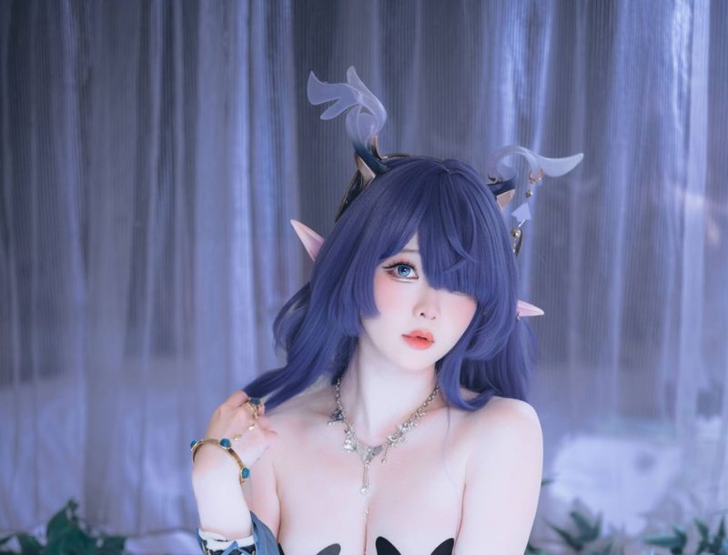 淡紫色的纱帘滤过柔光,把整个画面泡在雾蒙蒙的蓝调里,和菈乌玛身上水蓝色的裙装、深紫的发色完美呼应,像把月光揉进了场景里。霜月shimo的妆造细节太戳人了——精灵耳的弧度、角上的透明挂饰、颈间项链上的绿色宝石,连腰间的月形挂饰都还原得一丝不苟,连皮肤的光泽都像覆了层月光。她的眼神又软又静,握着白花的姿态温柔又松弛,把菈乌玛那种“被月神庇佑的霜月之子”的清冷感,揉进了每一个细节里。