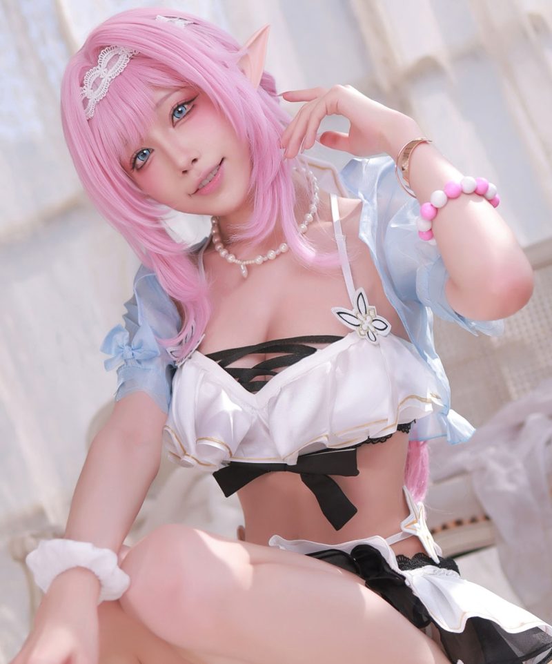 水淼Aqua这版爱莉希雅,整张图像裹在棉花糖味的柔光里,粉蓝撞色软乎乎的,像掉进了爱莉希雅的粉色梦境。水淼Aqua的妆造细节杀疯了——粉毛上的蕾丝发箍、精灵耳的弧度,颈间的珍珠项链和手腕的粉白串珠,连胸衣上的蝴蝶刺绣、腰间的黑蝴蝶结都完美还原,甜得人心都化了!